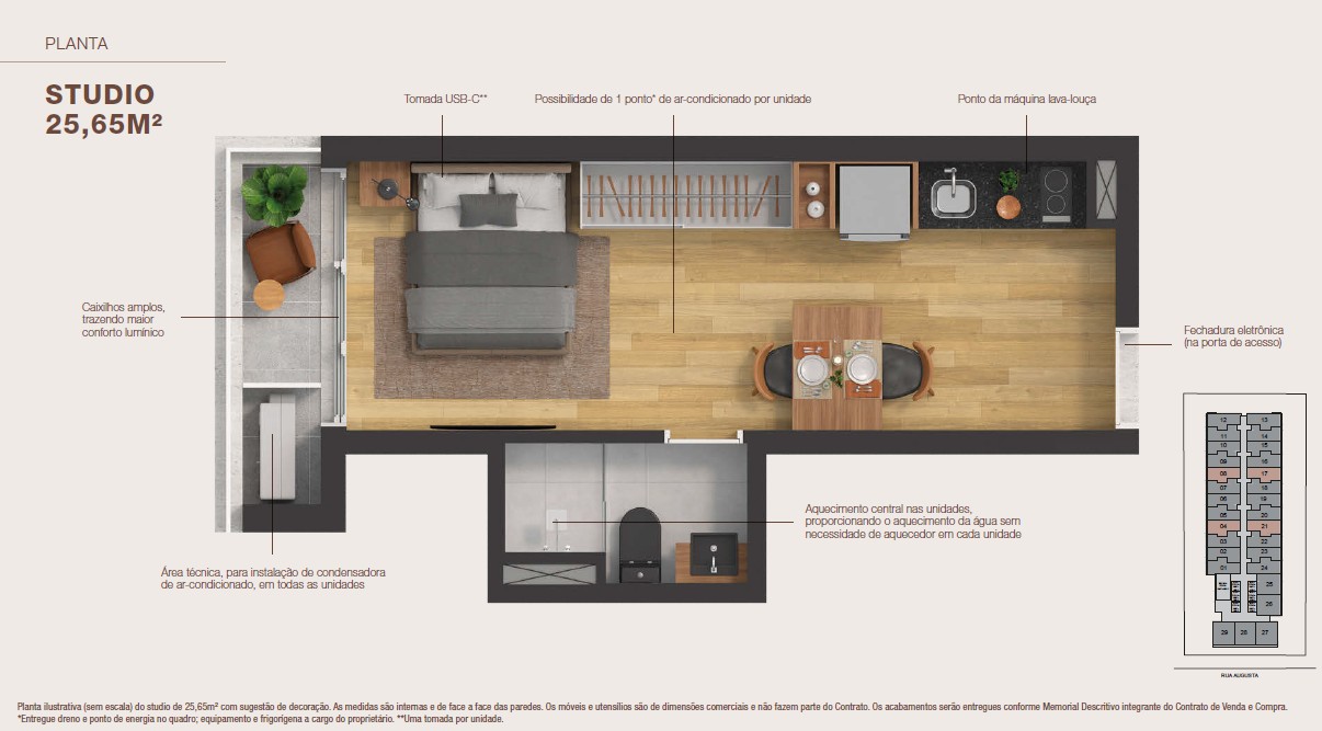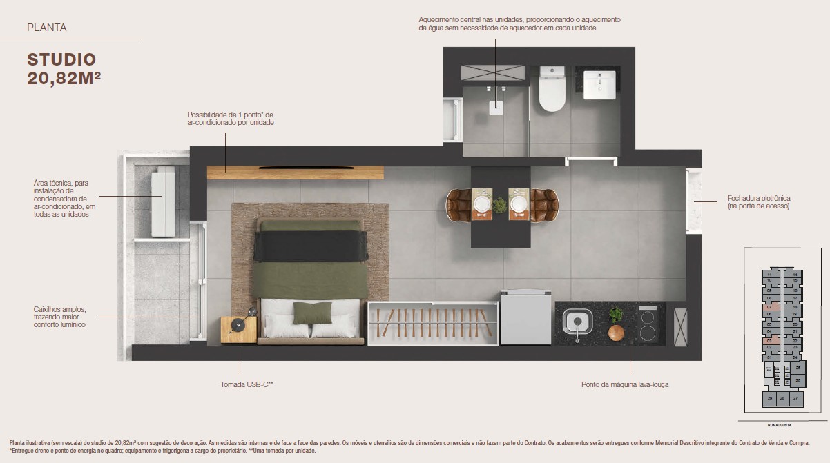 Sistema de aquecimento central que atenderá o chuveiro; entregue com tomada USB; Unidades entregues com infraestrutura para a instalação do equipamento de ar-condicionado