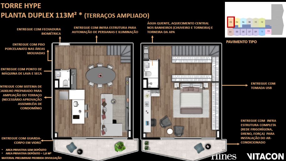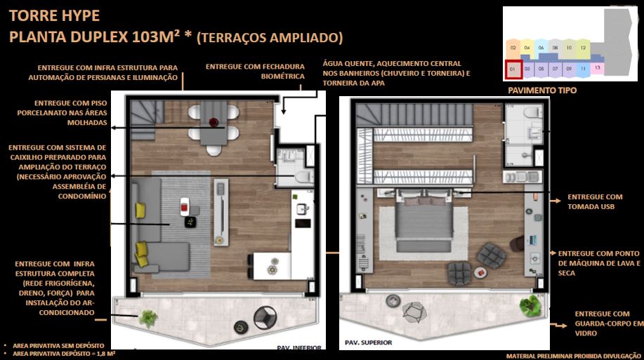 DIFERENCIAS ENTREGUES NAS UNIDADES: DEPOSITO PRIVATIVO NO SUBSOLO PARA AS UNIDADES DUPLEX; AQUECIMENTO DE AGUA CENTRAL, NOS CHUVEIROS E TORNEIRAS DOS BANHEIROS E APA; PÉ DIREITO LIVRE COM 2,8M²; PREVISÃO E INFRAESTRUTURA PARA AR-CONDICIONADO NA SALA E NOS QUARTOS; TOMADAS USB; PREVISÃO PARA AUTOMAÇÃO DE PERSIANAS ILUMINAÇÃO E AR-CONDICIONADO; PONTO DE AGUA E ESGOTO PARA MAQUINA DE LAVAR; PONTO DE GÁS E PONTO ELETRICO PARA COKTOP E COIFA NA COZINHA; PREVISÃO DE APROVEITAMENTO DO CAIXILHO PARA FUTURA AMPLIAÇÃO DA SALA