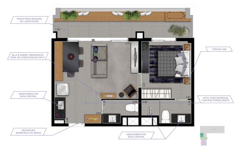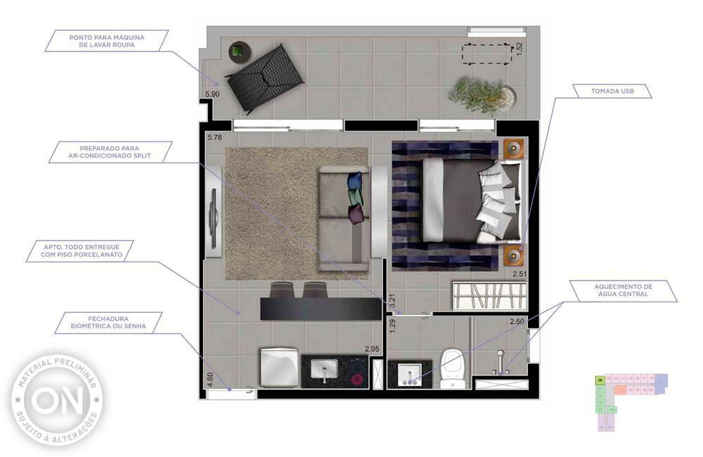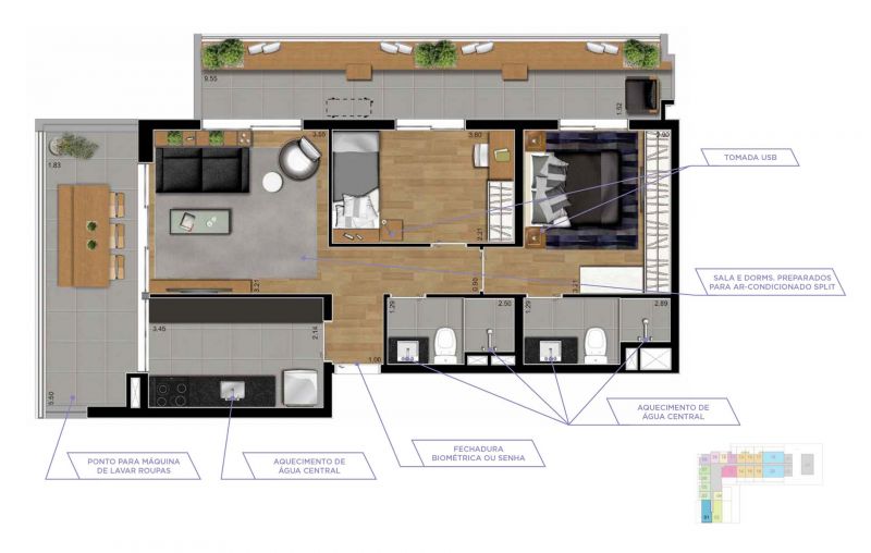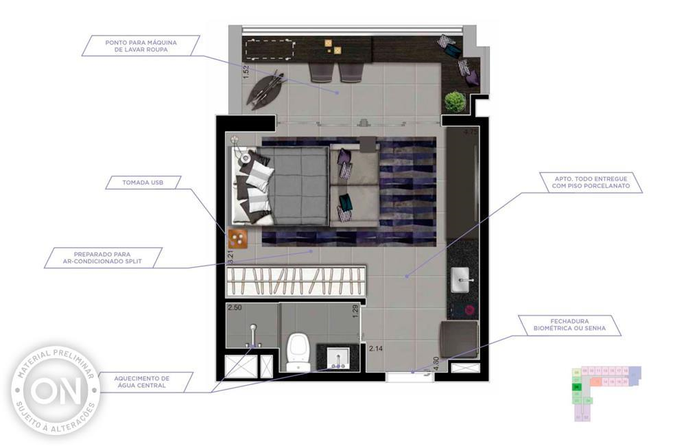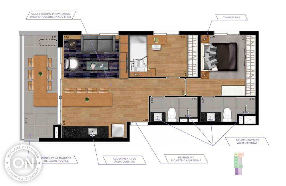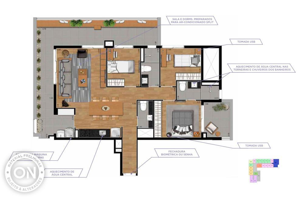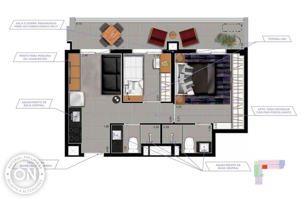 UNIDADES ENTREGUES COM: AQUECIMENTO CENTRAL DE ÁGUA NAS TONEIRAS DA PIA E CHUVEIROS* TOMADAS USB* FECHADURA BIOMETRICA* PISO EM TODA A UNIDADE, LUMINARIAS, INFRAESTRUTURA PARA INSTAÇÃO DE AR-CONDICIONADO MODELO SPLIT, PONTO PARA MÁQUINA DE LAVAR ROUPA, ÁGUA E ESGOTO.