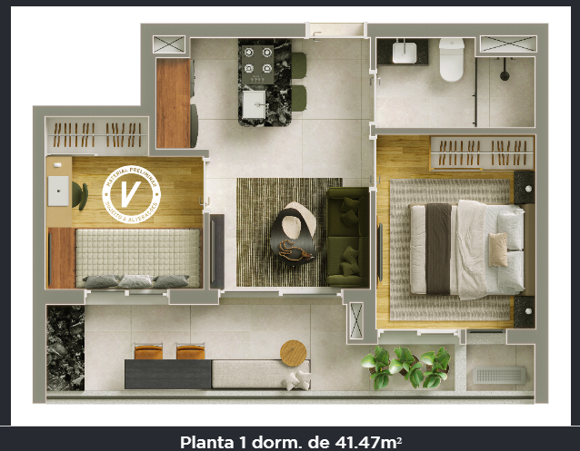 Tipologias: Cabo Verde 1 dorm de 25 a 33m² e 2 dorm de 41 a 43m² Alvorada Studios de 17 a 18m² e 1 dorm. De 55 e 56m²