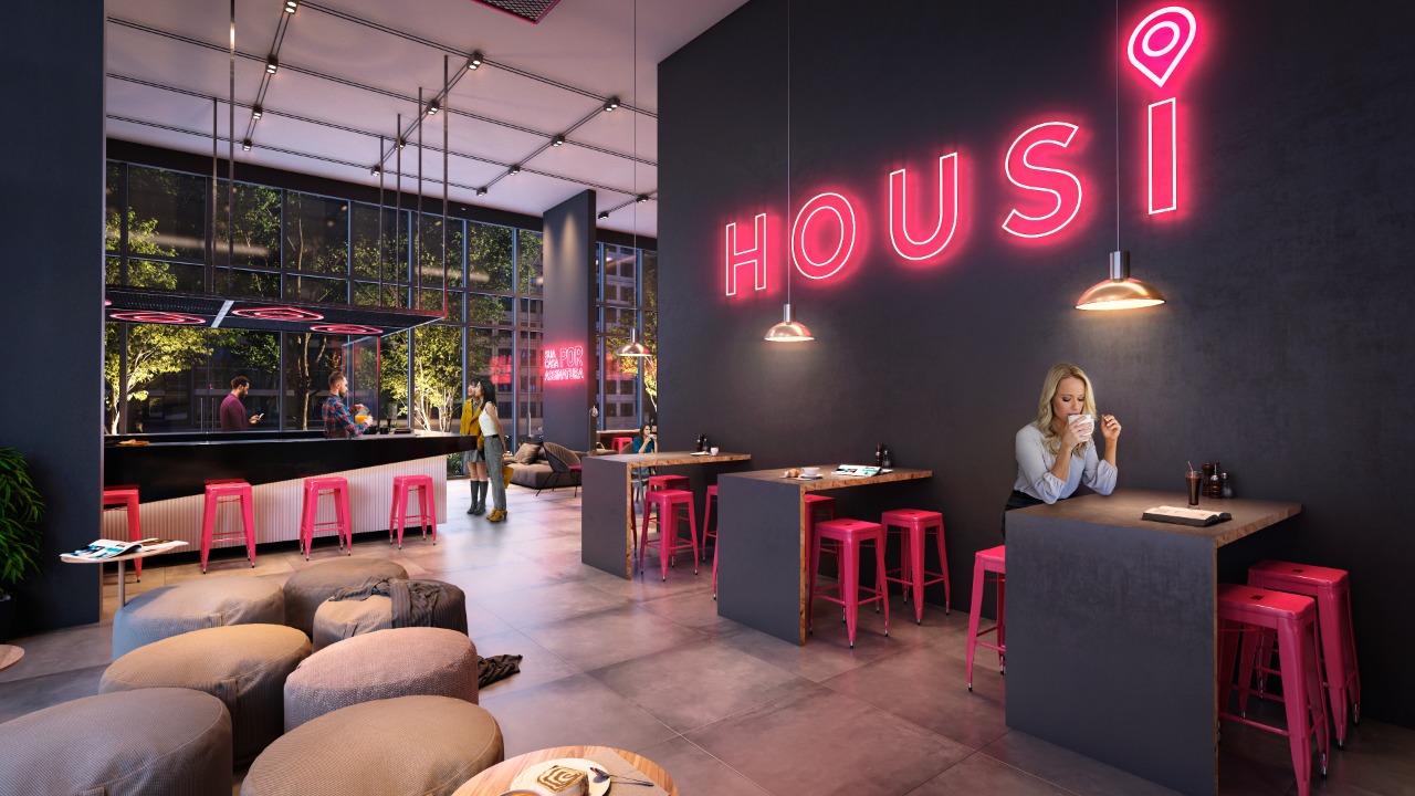 DIFERENCIAIS AREAS COMUNS: RECEPÇÃO CONCIERGE BAR; COWORKING; LOBBY; BICICLETARIO; SALAS DE REUNIÃO; FRESHUP ROOM; GRAB & GO (COMIDAS E BEBIDAS DISPONIVEIS 24 HORAS POR DIA); LAVANDERIA COMPARTILHADA BY OMO; MEGALOUNGE; HOUSI TALKS; SKYBAR; FITNESS; FITNESS DESCOBERTO; HOUSI ENTREGAS; MALEIRO; SALA PILATES E SOLARIUM DIFERENCIAIS